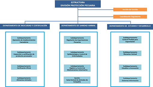 Para llevar a cabo estas responsabilidades, la División se organiza internamente en tres departamentos, los cuales definen las políticas nacionales de sanidad animal, inocuidad y certificación para la exportación de los productos e insumos de origen animal, y gestionan programas, proyectos específicos y planes institucionales, tanto a nivel central como regional.