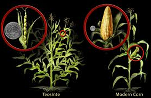 Figura 1: Evolución morfológica (nótese espigas y ramificaciones) desde un tipo de Teosinte al Maíz