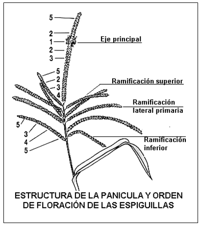 La panícula es la inflorescencia apical. Está formada de un eje principal y de ramificaciones laterales, en la cual cada una de las partes, en términos botánicos, está formada de espiguillas.