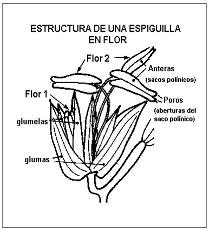 Cada espiguilla está compuesta de dos flores, cada flor de tres estambres. Las dos flores de una misma espiguilla no liberan su polen al mismo tiempo: una de las dos flores tiene un adelanto de 3 a 4 días. Para una única panícula, la liberación total del polen dura 8 a 10 días. La germinación del polen es inhibida por las altas temperaturas. La floración de las espiguillas ocurre en un orden bien preciso y comienza sobre la rama principal de la panoja. La emisión de polen ocurre durante el día, comenzando al amanecer, para alcanzar su máximo a media mañana. La duración de vida del polen es generalmente de algunas horas solamente.