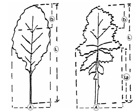 Hoja: dentado (D), longitud (L), anchura (A) y longitud del pecíolo (Lp).